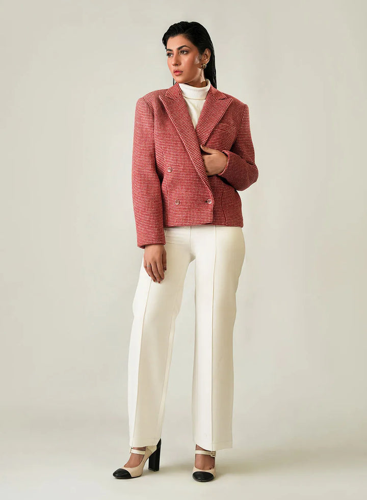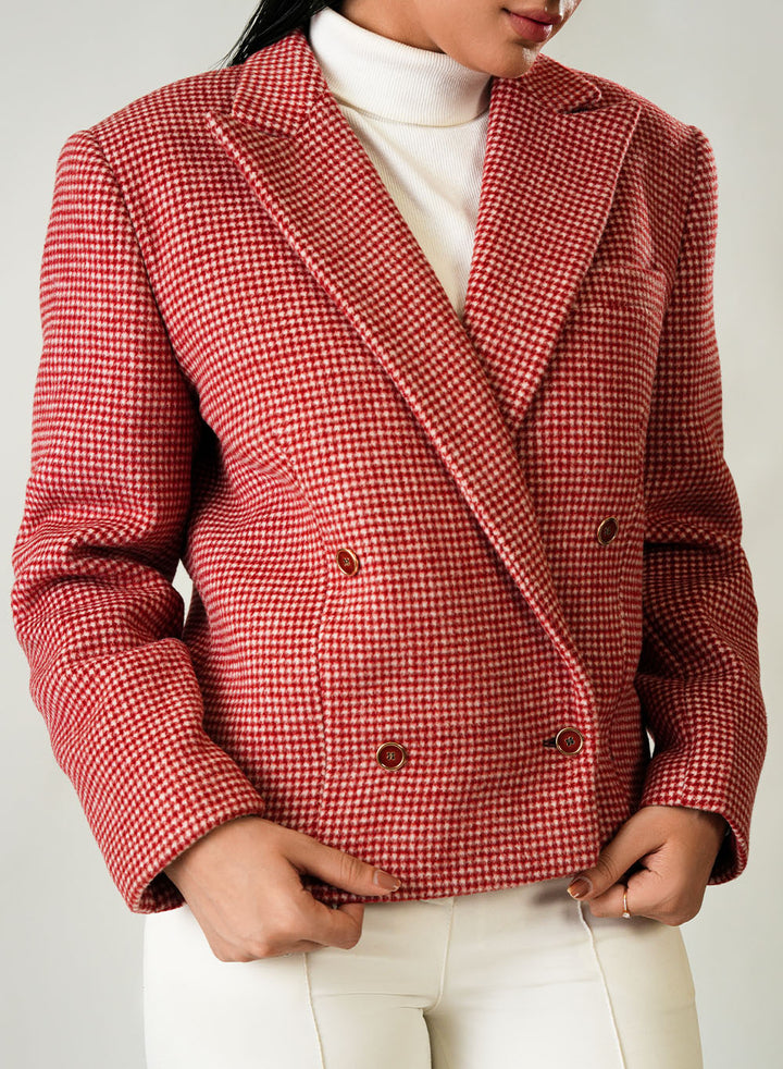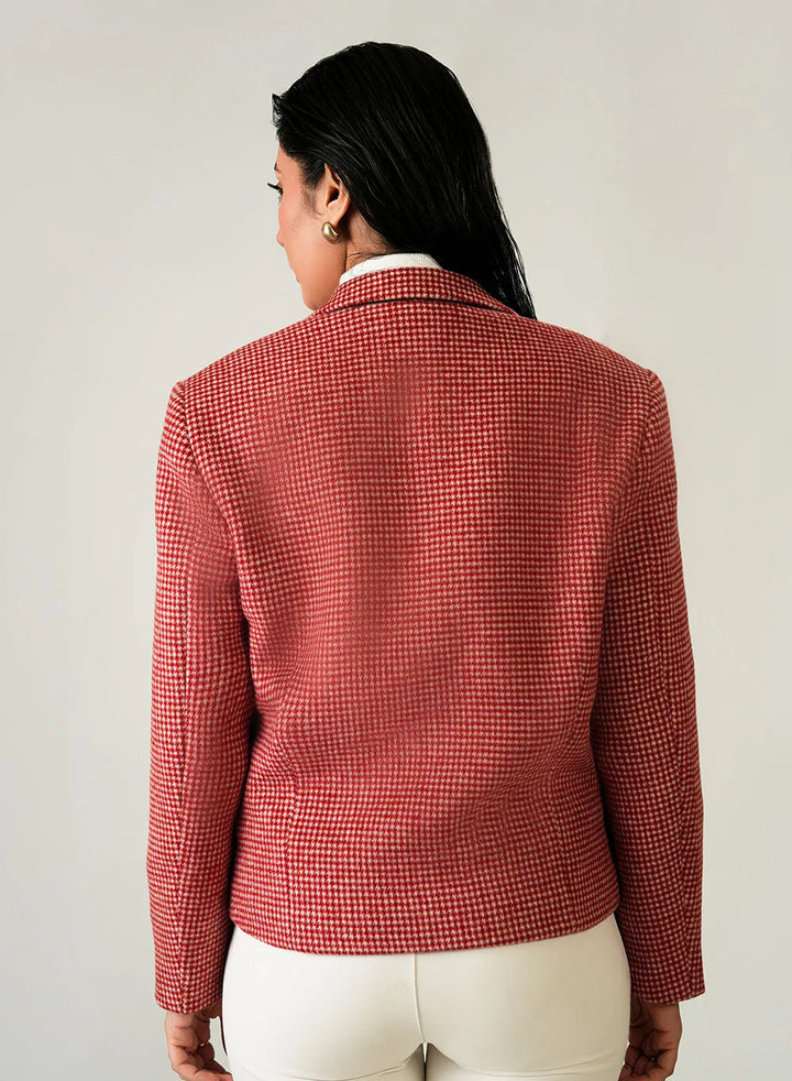 Make a bold fashion statement with this Ladies Jacket. It features a vibrant Red and White checkered pattern and is made from warm Woolen Fleece material to keep you cozy and trendy.