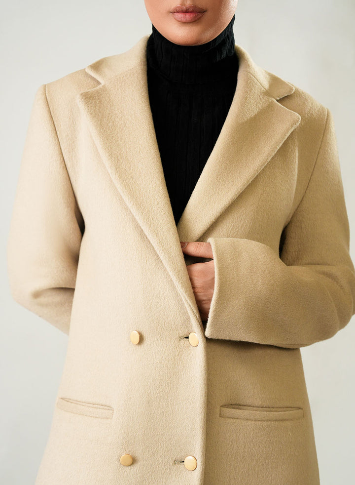 Ladies Long Coat - Woolen Fleece Beige Plain